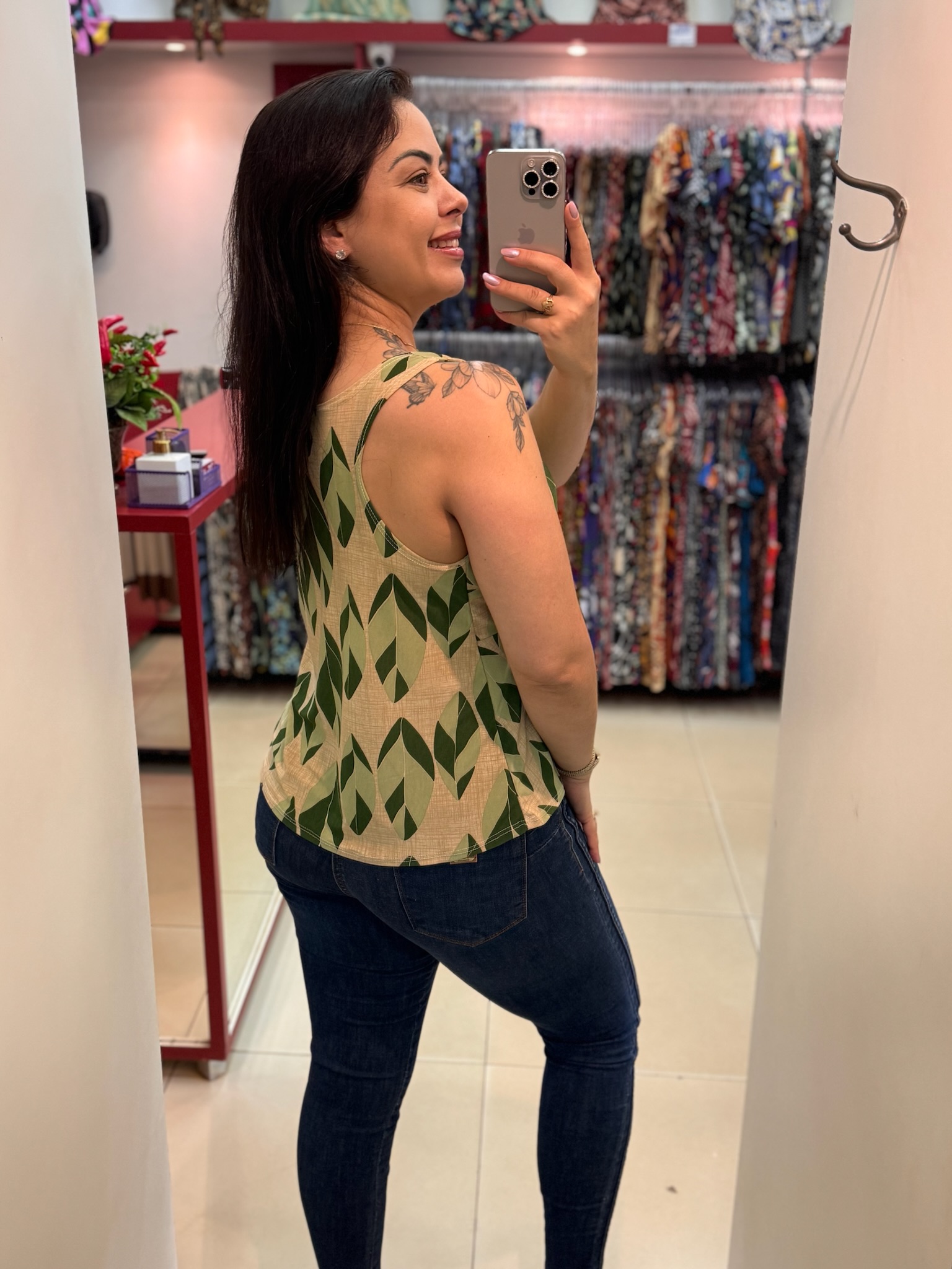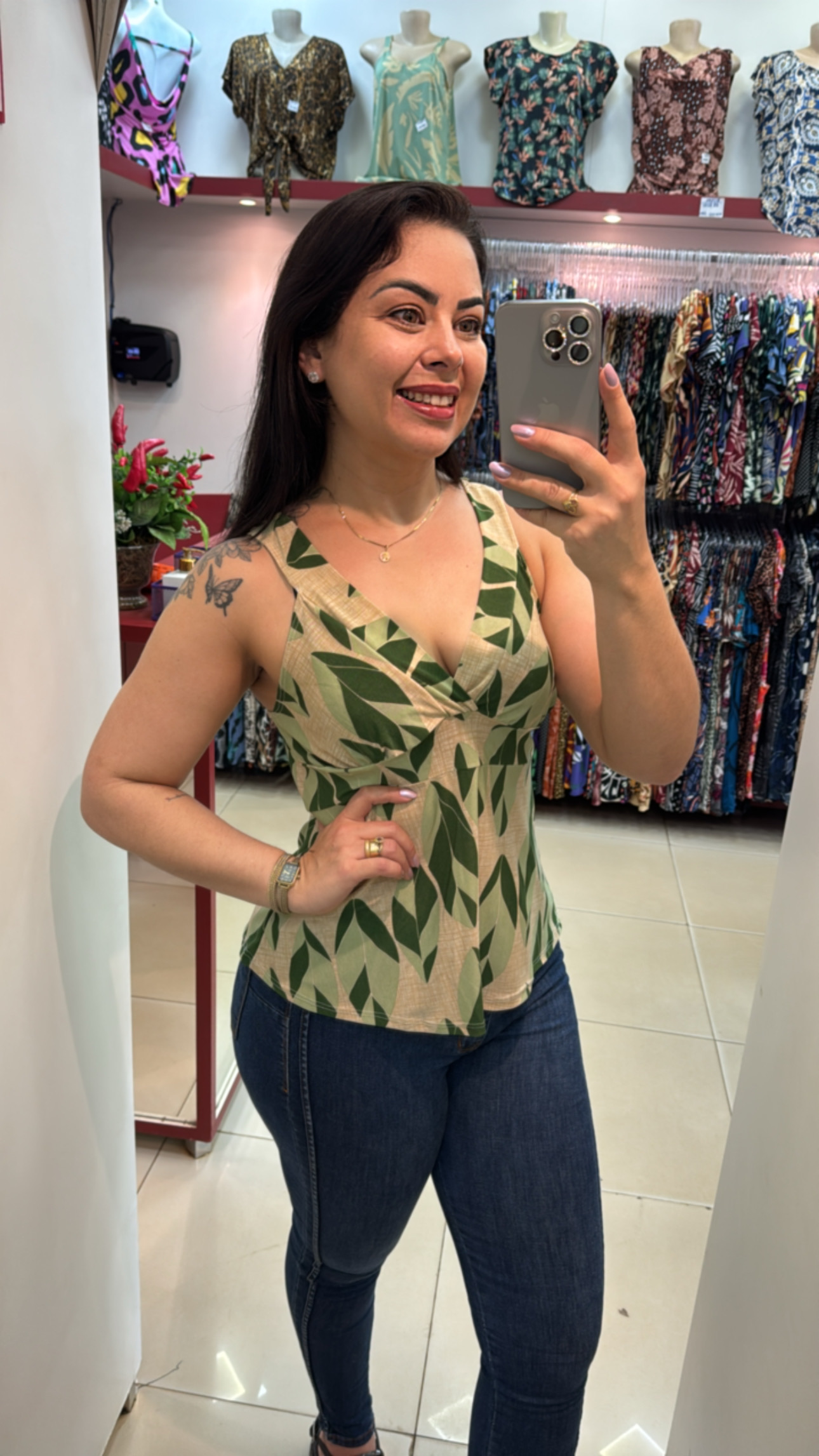 Olá, sou uma blusa sem mangas com decote em “V” profundo criado por duas faixas largas transpassadas na parte frontal. A minha cintura é marcada por uma faixa horizontal, proporcionando ajuste e definição à silhueta. A minha parte inferior possui uma leve abertura em formato A, formando um estilo de bata.