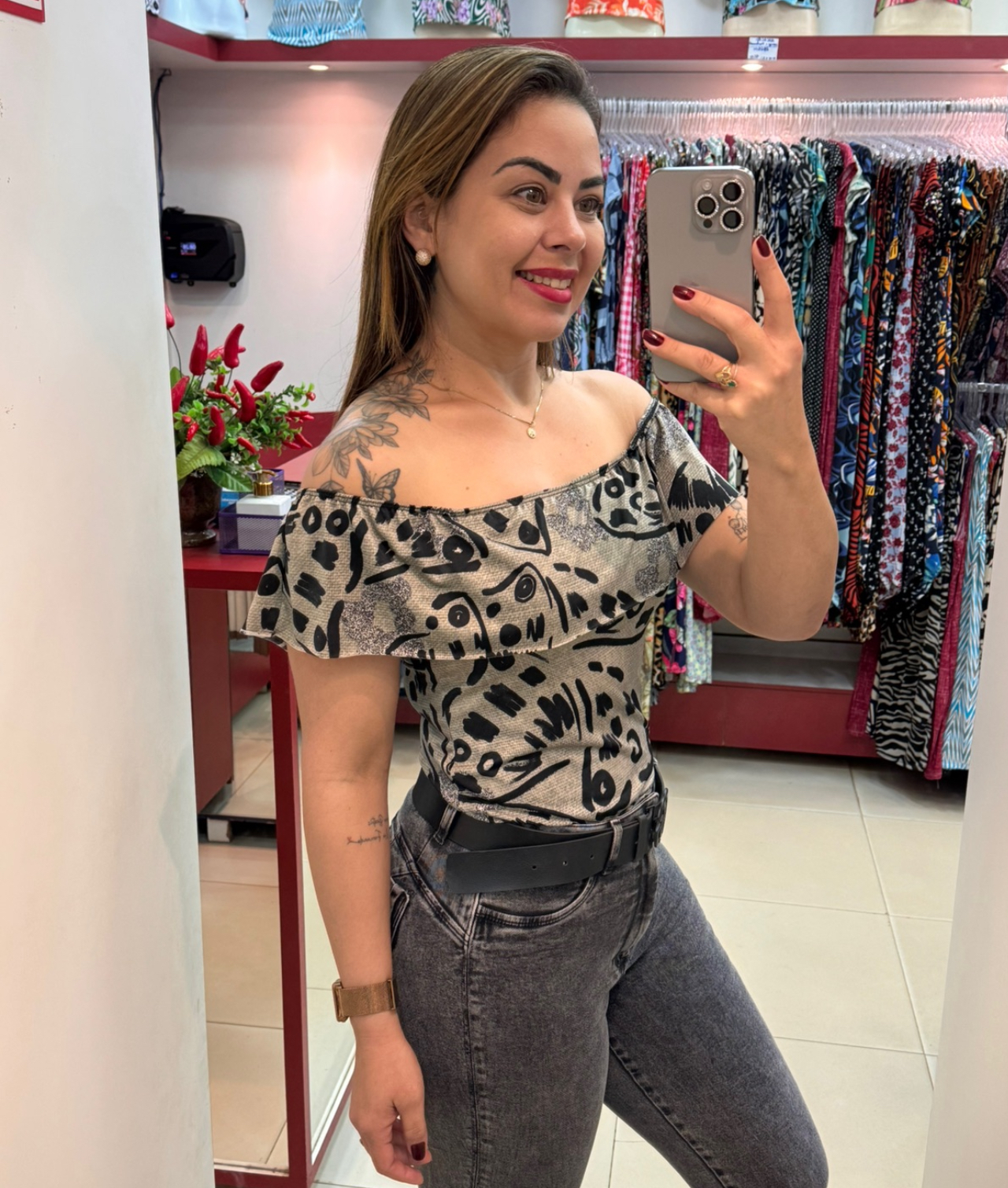 Olá, sou uma blusa que tenho como destaque minha gola estilo ciganinha, com a pala larga e com elástico embutido que permite me ajustar para criar o efeito de franzido, deixando os ombros à mostra.
