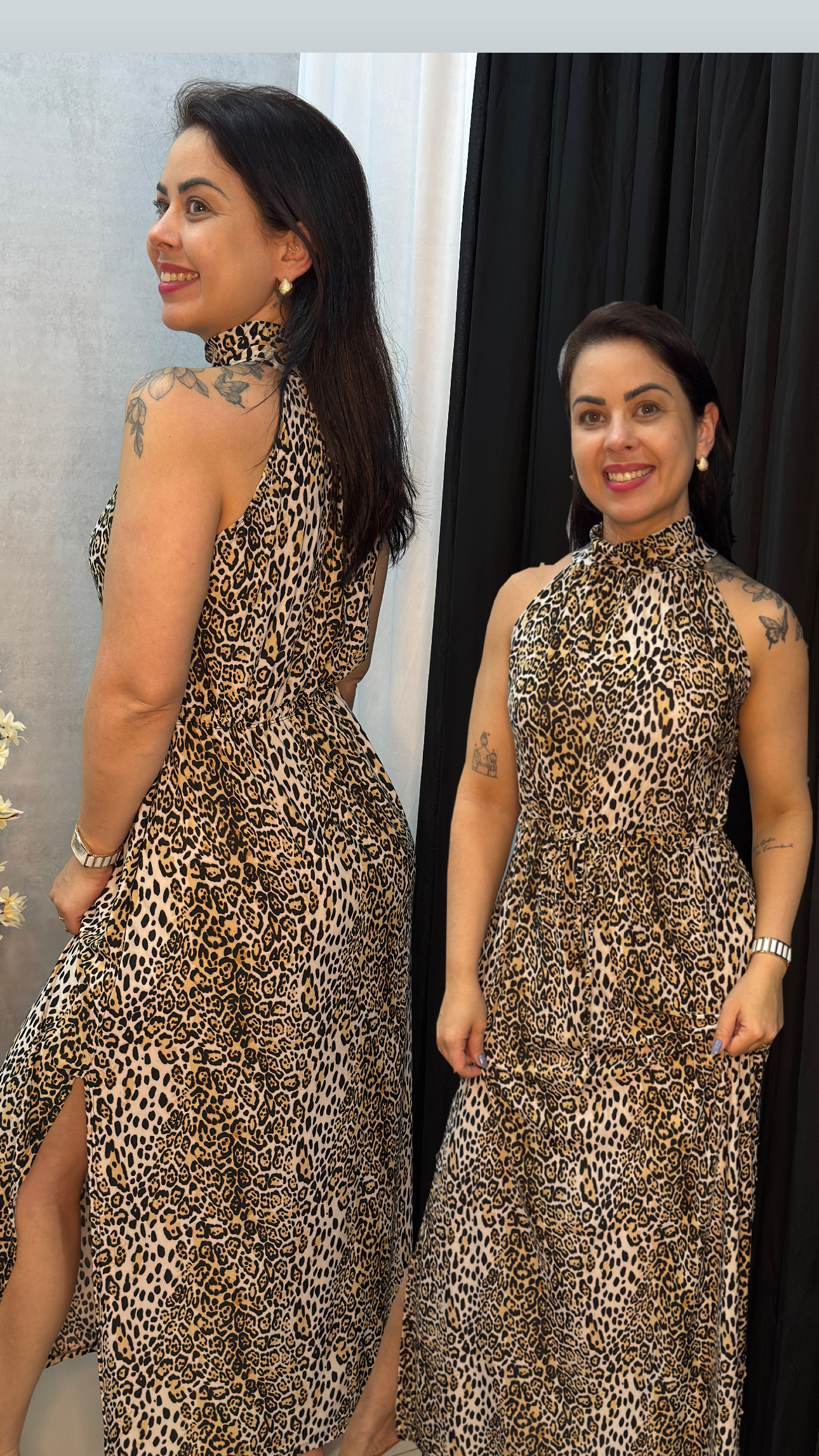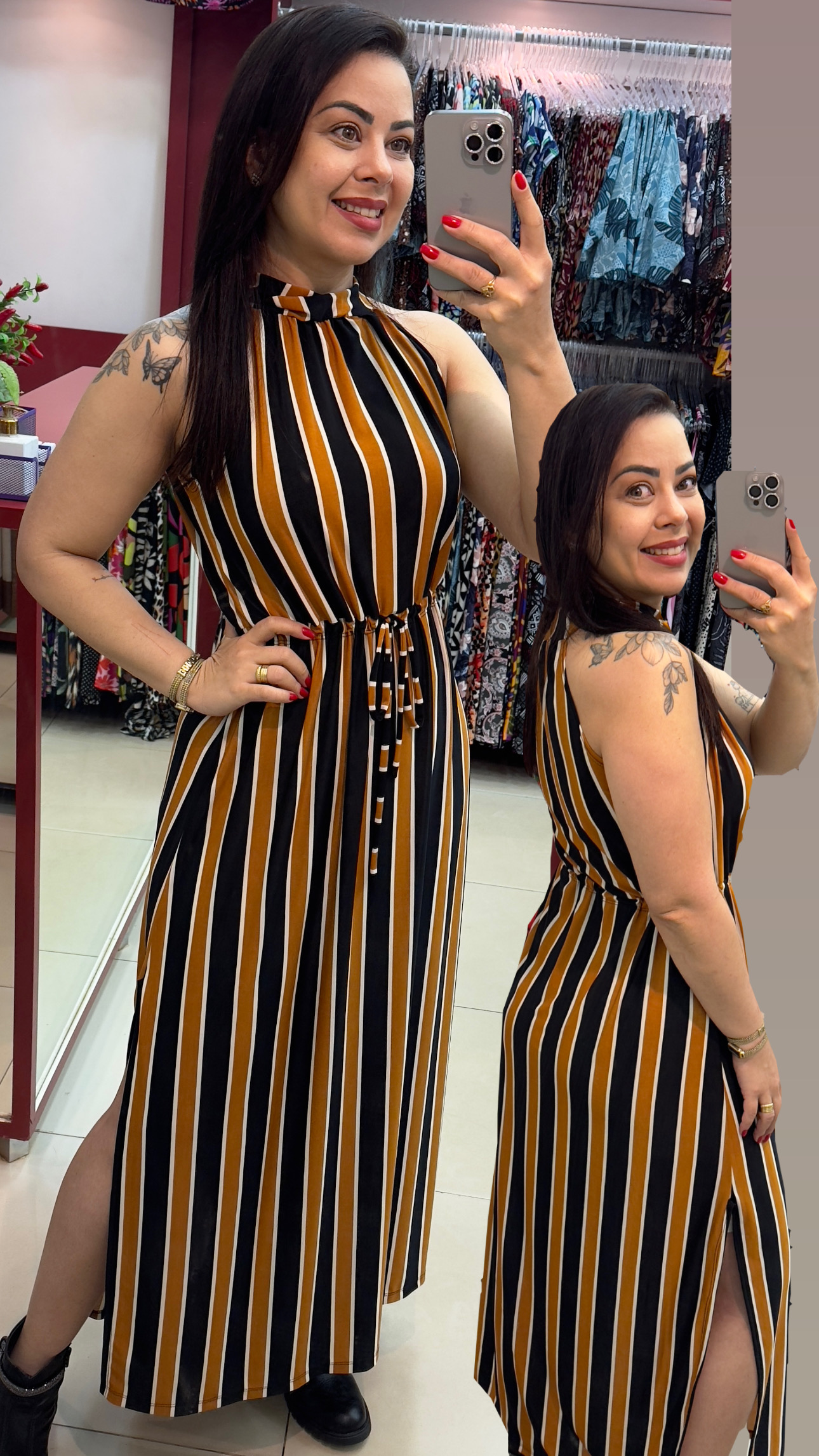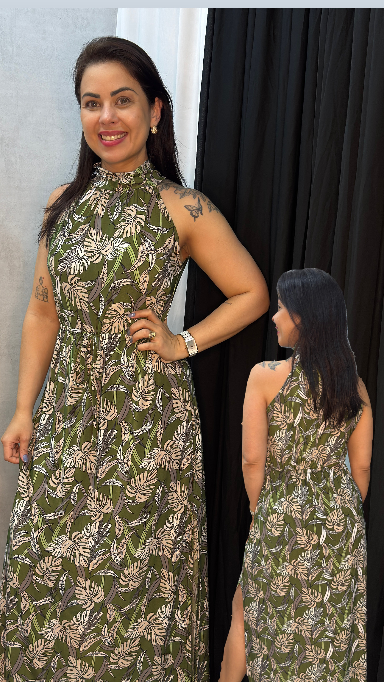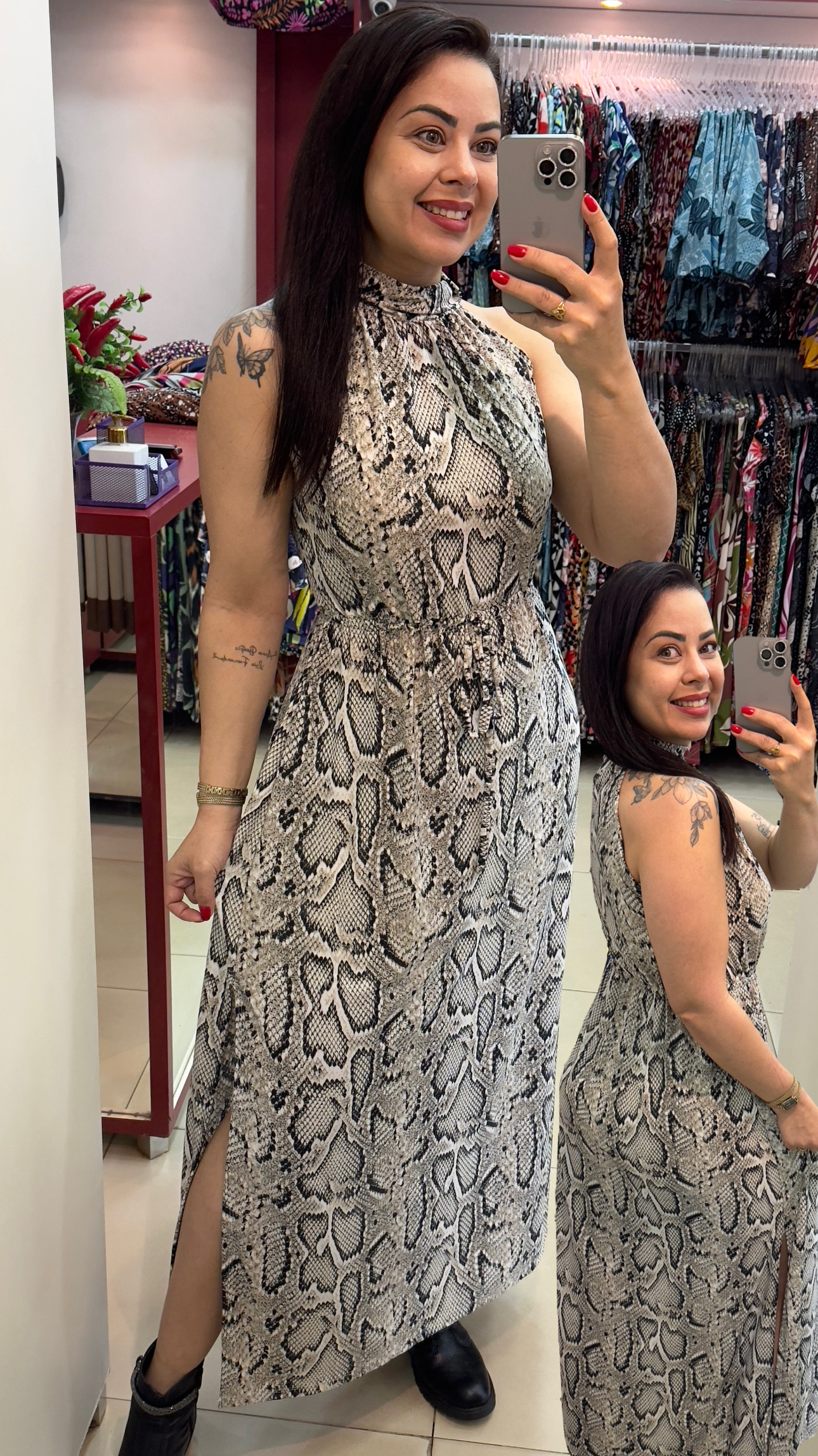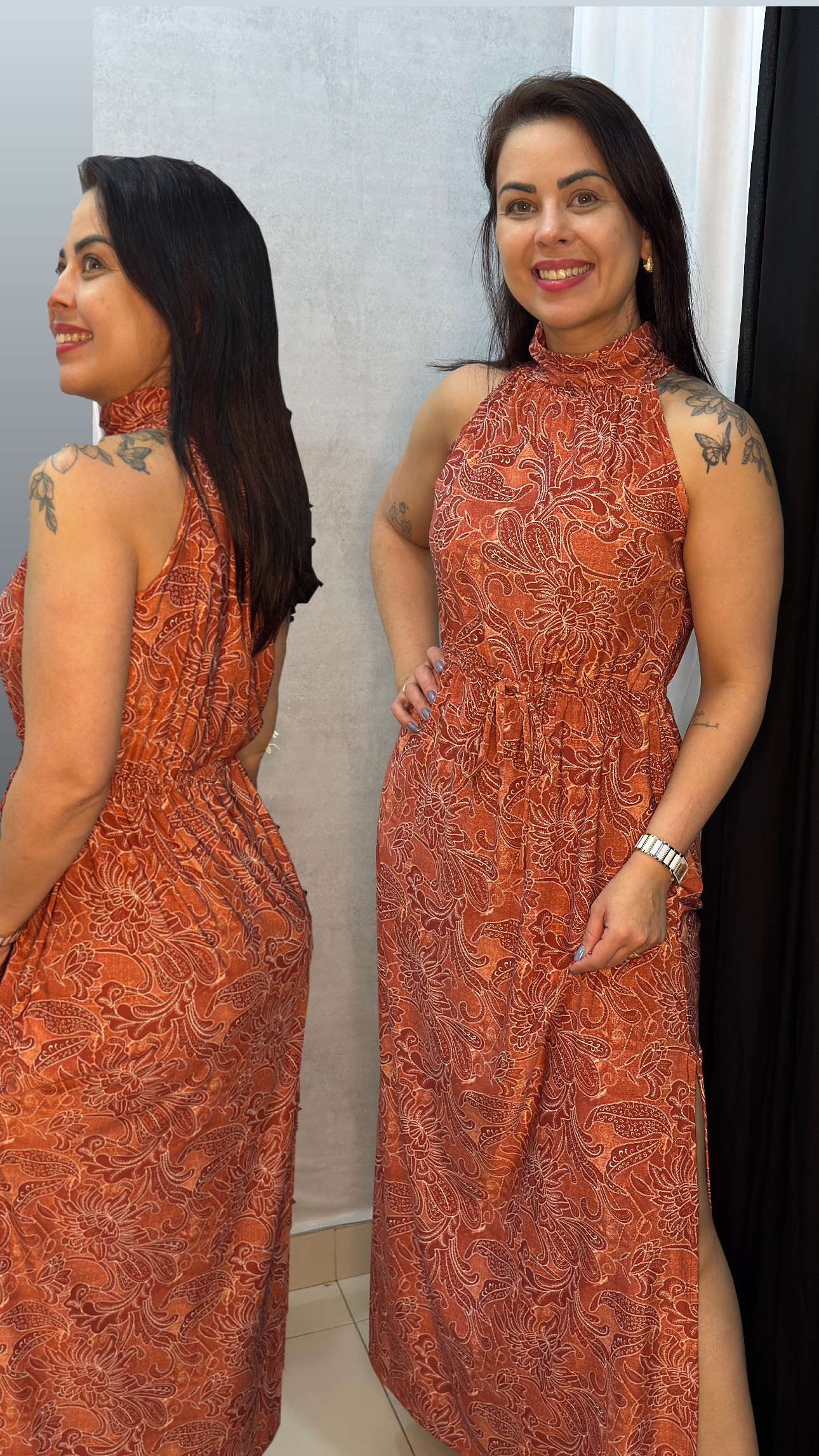 Sou um vestido longo que exala elegância com um toque contemporâneo. Minha gola alta traz sofisticação instantânea, enquanto minhas laterais contam com fendas discretas, perfeitas para revelar um pouco de atitude a cada passo. Tenho um caimento fluido que valoriza o corpo, e um ajuste na cintura com amarração delicada, que marca a silhueta com charme e conforto. Sou a escolha ideal para ocasiões especiais ou momentos em que você quer se sentir poderosa e refinada.