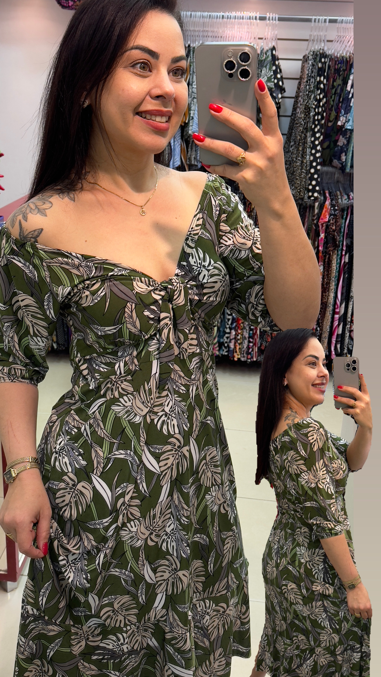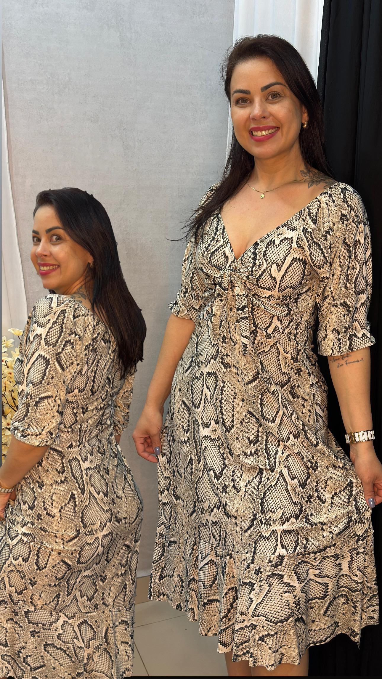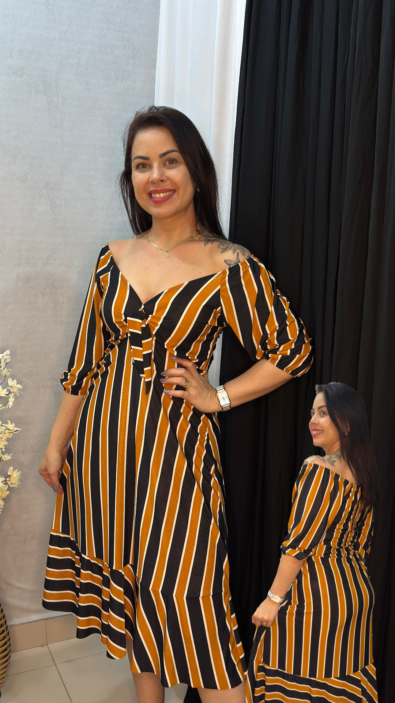 Sou um vestido leve, feito para encantar. Meu busto é decorado com um pequeno laço central, logo acima de um recorte sutil que revela um pouco da pele, criando um toque ousado e delicado ao mesmo tempo. Minhas mangas são 3/4, bufantes e soltas, caindo com graça sobre os ombros. Tenho uma cintura bem marcada, valorizando as curvas de quem me veste. Minha saia é fluida e termina com um babado que balança suavemente a cada passo. Na parte de trás, ofereço um charme discreto com mangas 3/4 e franzidas no decote, mantendo o mesmo babado na barra da saia. Sou romântico, feminino e perfeito para momentos especiais.