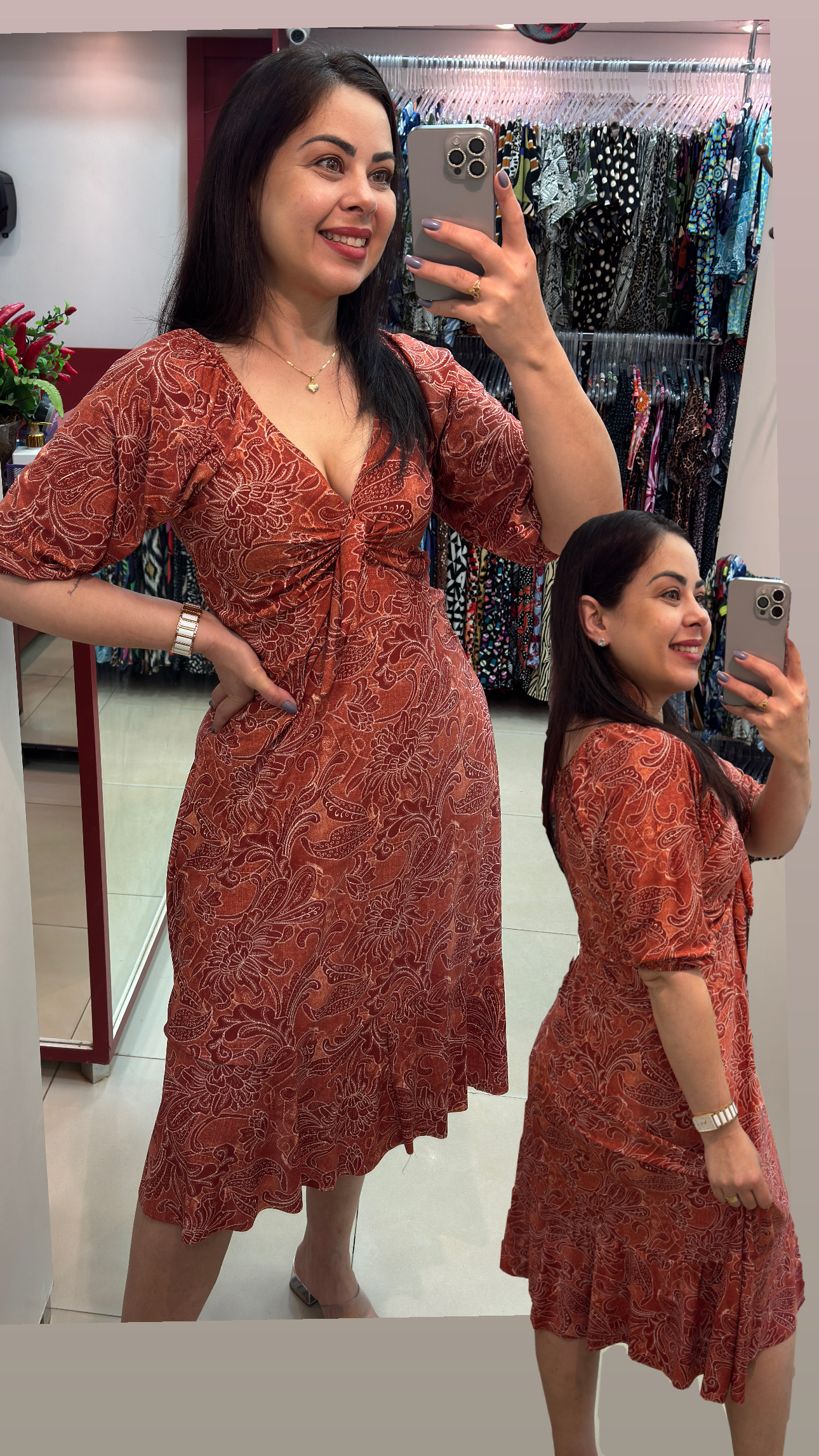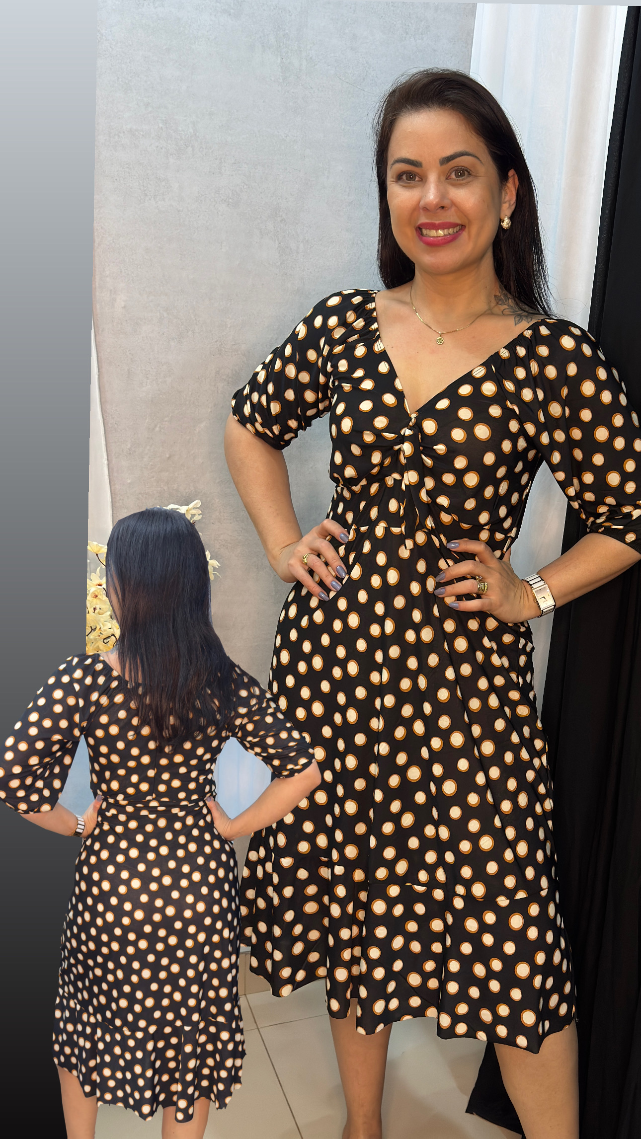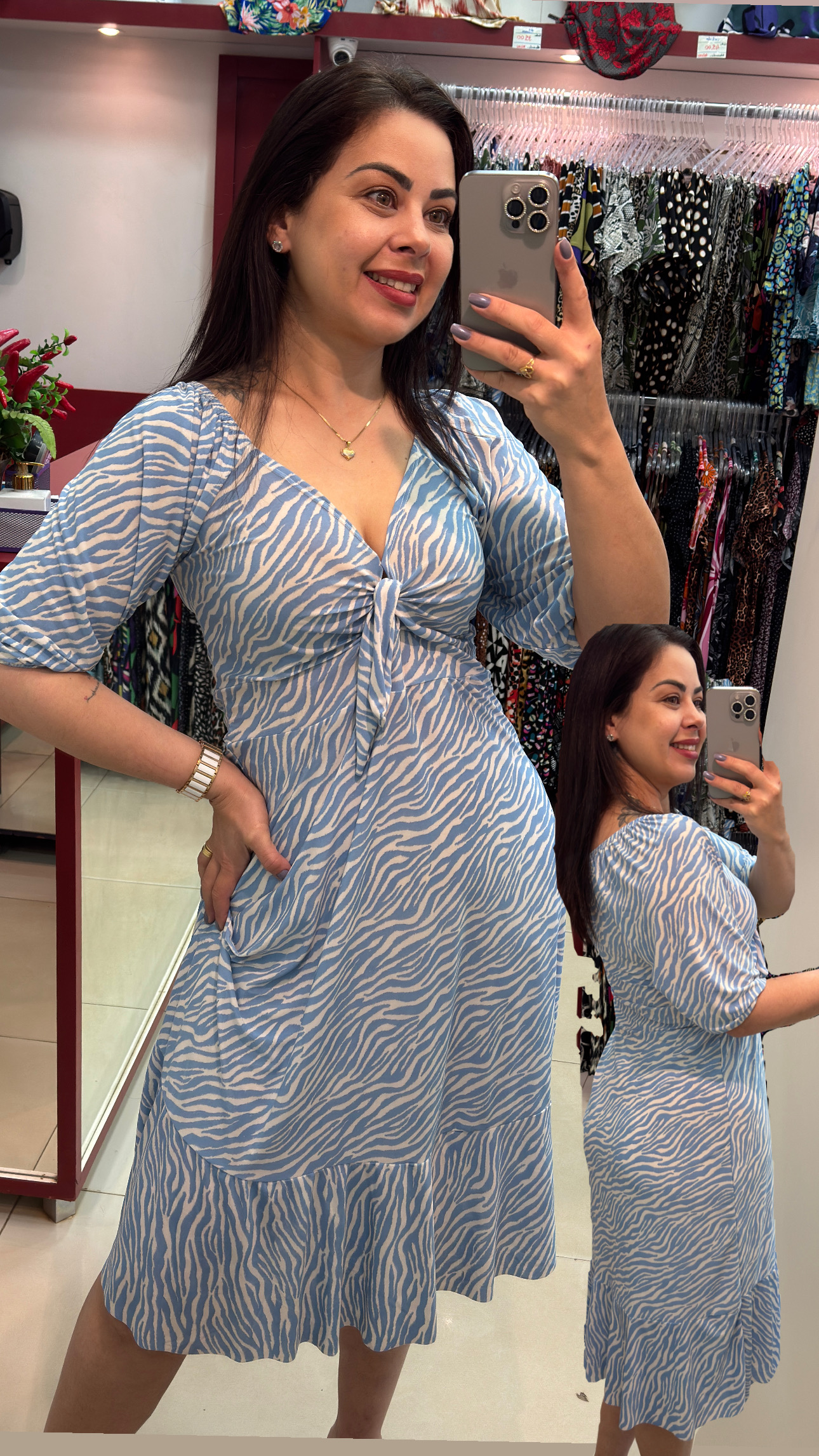 Sou um vestido leve, feito para encantar. Meu busto é decorado com um pequeno laço central, logo acima de um recorte sutil que revela um pouco da pele, criando um toque ousado e delicado ao mesmo tempo. Minhas mangas são 3/4, bufantes e soltas, caindo com graça sobre os ombros. Tenho uma cintura bem marcada, valorizando as curvas de quem me veste. Minha saia é fluida e termina com um babado que balança suavemente a cada passo. Na parte de trás, ofereço um charme discreto com mangas 3/4 e franzidas no decote, mantendo o mesmo babado na barra da saia. Sou romântico, feminino e perfeito para momentos especiais.